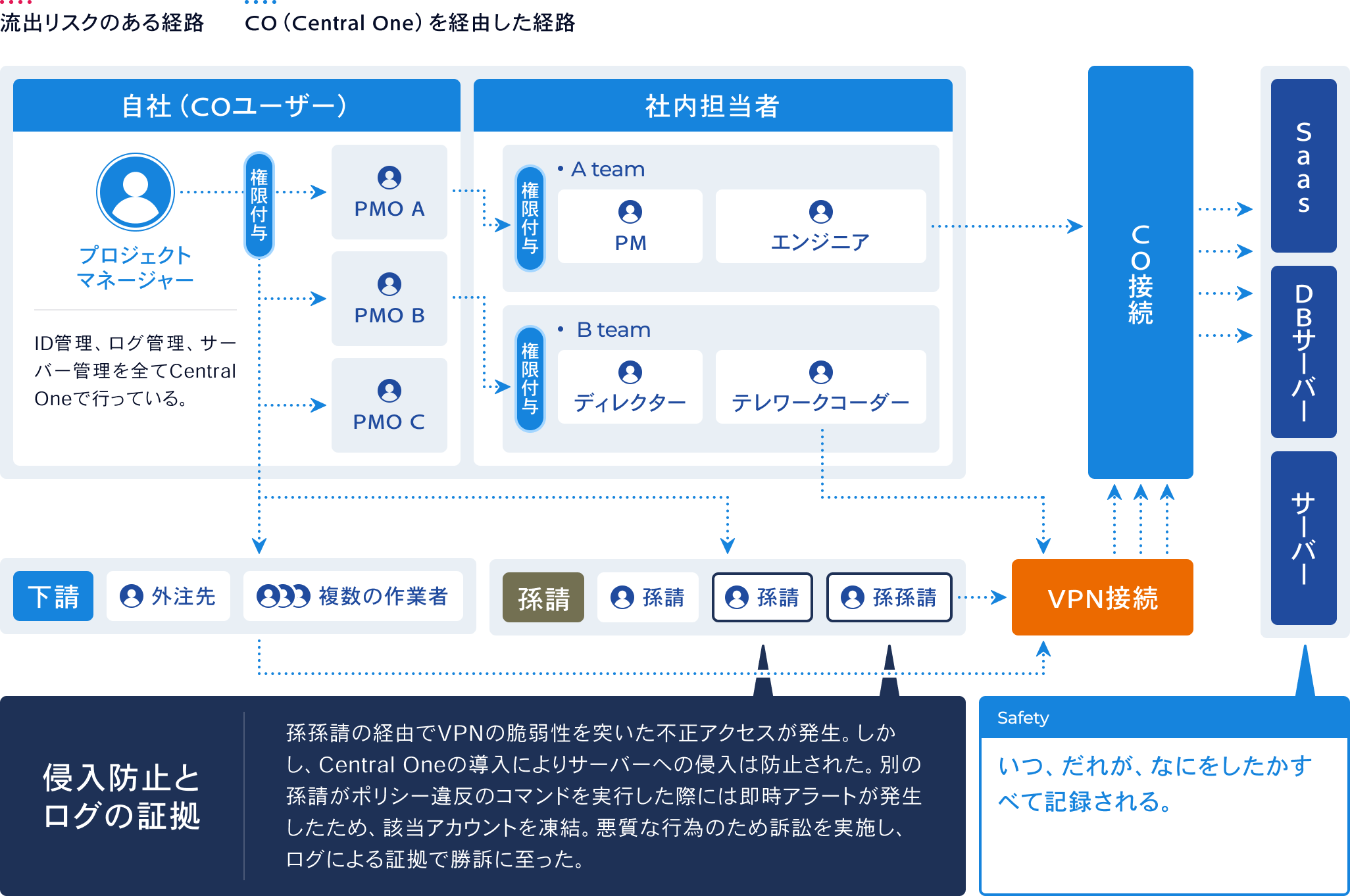 委託先の環境まで徹底したセキュリティ対策を行うのは難しく、重大なインシデントのあとに「原因が分からない」というケースも珍しくありません。Central Oneなら、禁止された操作は即座にアラート通知を行うことができるほか、対象のアカウントを凍結させることも可能です。原因不明なのまま、再発に繋がるという事態を避けることができます。