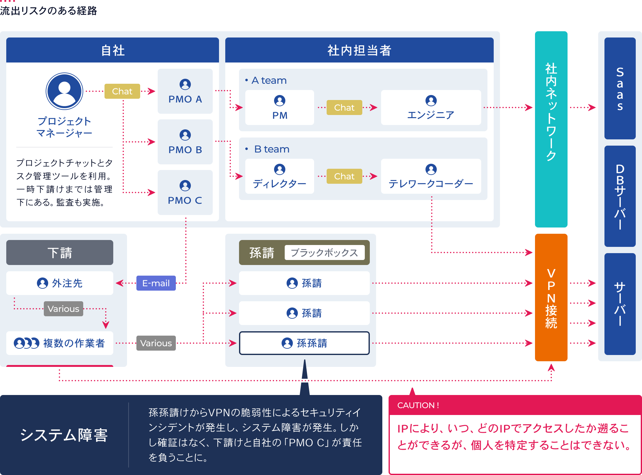 大型案件など、社内リソースだけでは対応が難しい場合は外注先に協力してもらう場合があります。一時下請の外注先がセキュリティ対策や取り扱いルールに厳しい基準を設けていても、その先の孫請会社が同等の環境であるかや、万全なセキュリティ対策を行なっているかはわかりません。こうした作業者の多い大型案件では、インシデントが発生した場合に原因の特定と再発防止にかかるコストは大きくなってしまいます。