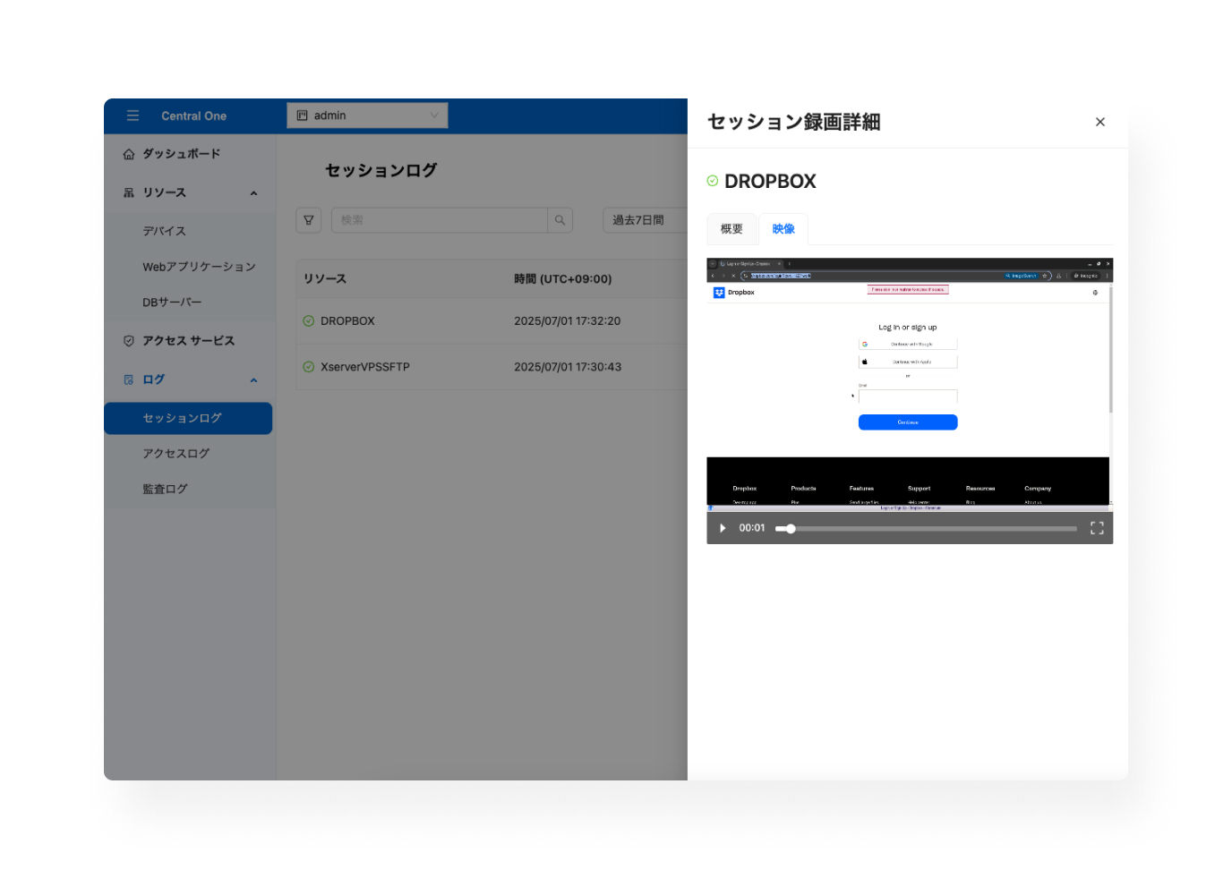 Central Oneでは、アクセス開始から操作の終了まで、すべてのログを動画で記録・可視化します。記録は改ざんできず、万が一の時の証拠として活用できるため、監査対応やセキュリティ対策にも効果を発揮します。