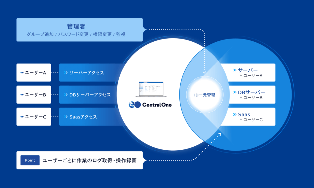 「Central One(セントラルワン)」は、サーバーやクラウド、Webアプリ、外部委託先のアクセスまでを一元管理し、操作のすべてを録画・記録する日本発の特権ID管理(PAM)ソリューションです。